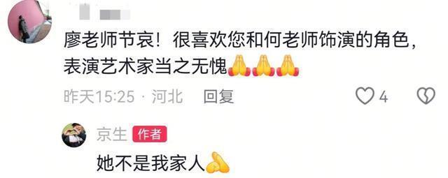 然而,也正是在这个时刻,一个关于她“再婚”的传闻被重新放大。 何晴生前也被多次问及与廖京生的关系,每次都笑着摆手否认: “廖老师是特别好的演员,我们拍戏时特别默契,但也就到这了。网上那些说法,我看了都觉得好笑,不知道是谁编的。” 即便他多次澄清,依然有很多人不相信。 在送别何晴后,廖京生实在不忍心看到谣言继续传播下去,于是在评论区回复了多位网友留言。