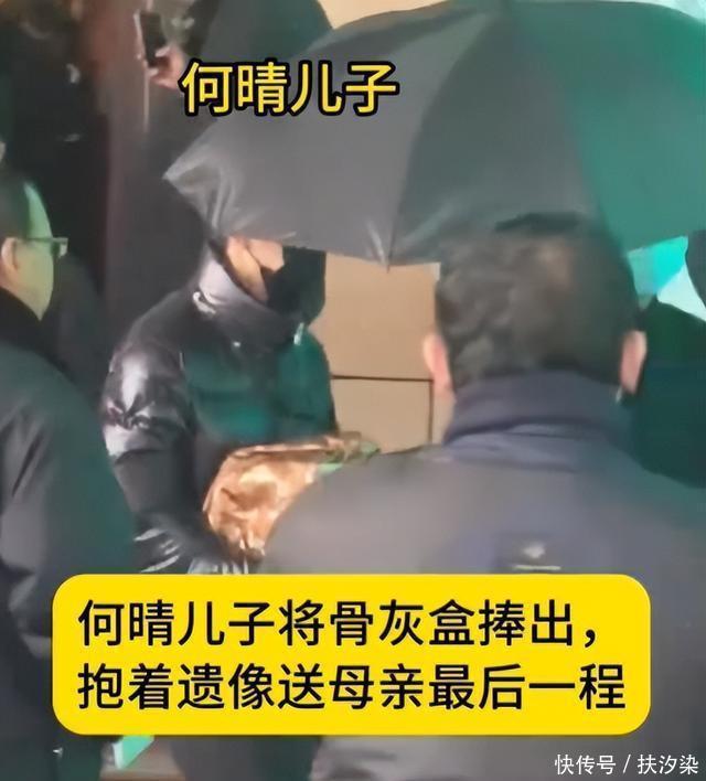 仪式现场,何晴与许亚军的儿子许何抱着母亲的骨灰盒走出告别厅,他戴着黑色口罩,双眼无神。
