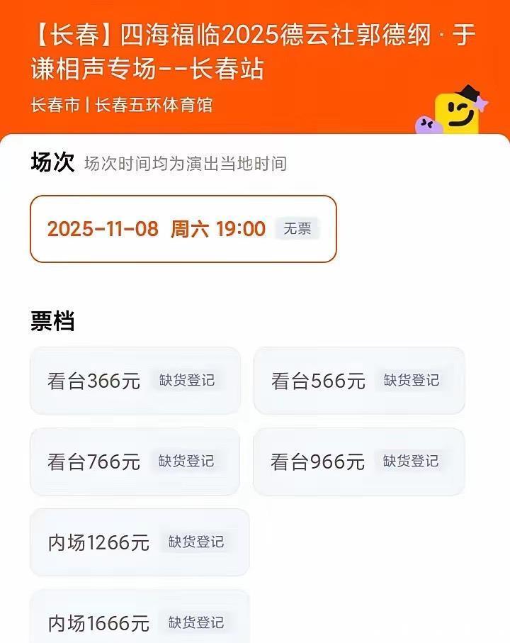郭德纲和老搭档于谦,在长春市体育中心五环体育馆,也安排了相声专场。不管是郭麒麟的京剧巡演,还是郭德纲相声专场,各个段位的门票、也都已经售罄了。
